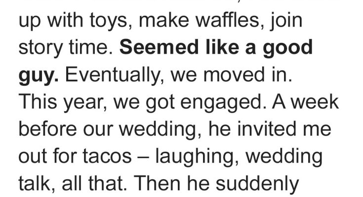 That belief unraveled a week before our wedding.We were sitting at the little Mexican place we adored. It had flickering fairy lights and a mango margarita that could melt the week off your shoulders. We had just booked the last vendor, the folding chairs, fairy lights and tables for the backyard, and I was still riding the buzz of finalizing things.Our wedding was going to be simple. It was going to be heartfelt and intimate. From the moment Jake proposed, I knew that I wanted the kids to be a part of the day.