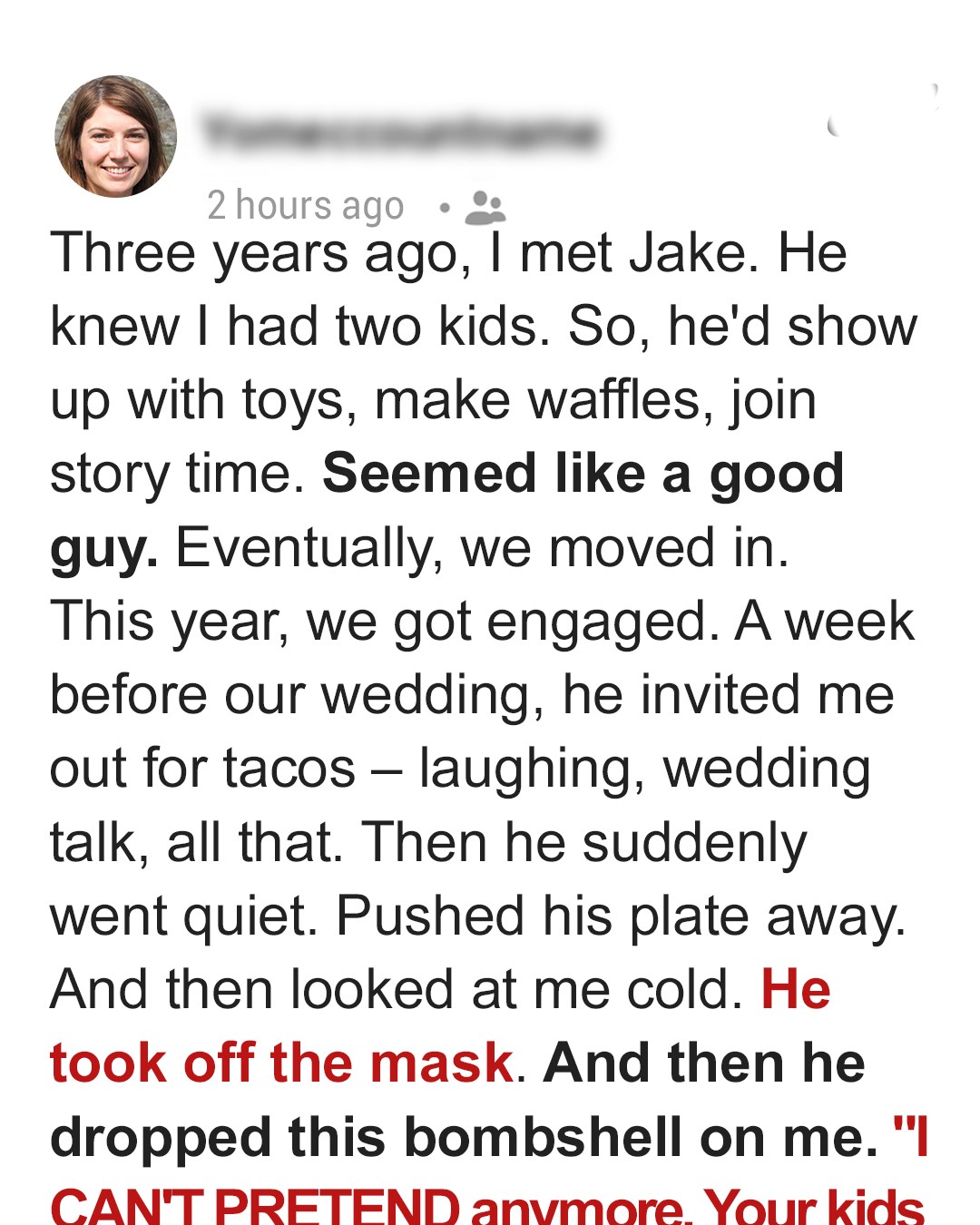 For the past three years, Jake had been that comfort. He was the warm space at my back when I folded laundry at night. He was the person who rubbed circles into my shoulders when I burned dinner because I was distracted by something else.Jake was the one who brought me a lemon donut on my birthday and whispered, “I remembered, honey.”But more than anything, he was the man who looked at my children not just with tolerance… but with what I believed was love.