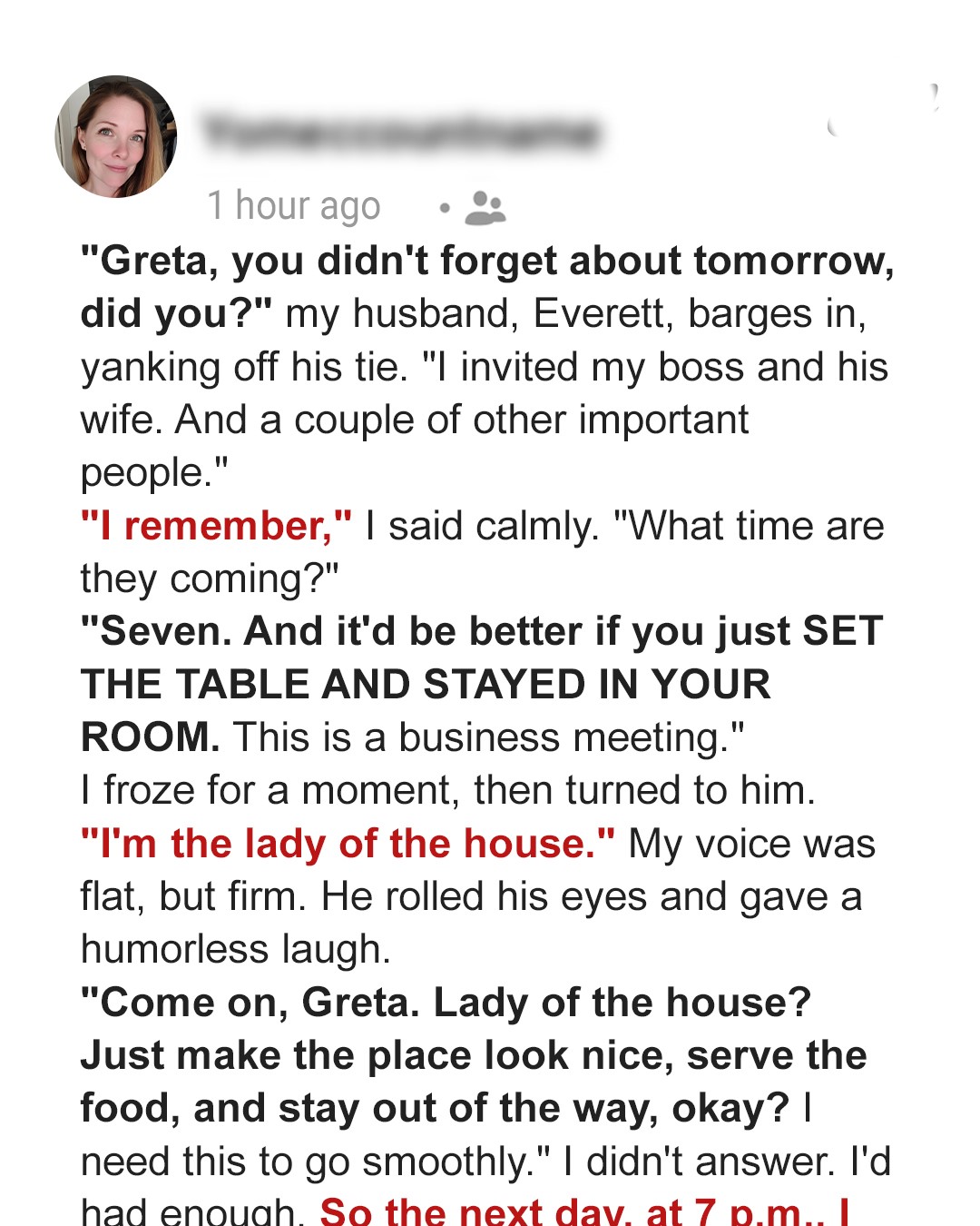 “I’m the lady of the house, Rett,” I said. My voice wasn’t angry, just… factual.My husband scoffed and gave a humorless laugh, still walking past me.“Come on, Greta. Lady of the house? Just make the place look nice, serve the food, and stay out of the way, okay? I need this to go smoothly.”And then, as if he hadn’t just slashed through whatever dignity remained between us, he muttered something about the wine not being chilled and disappeared into the bedroom.