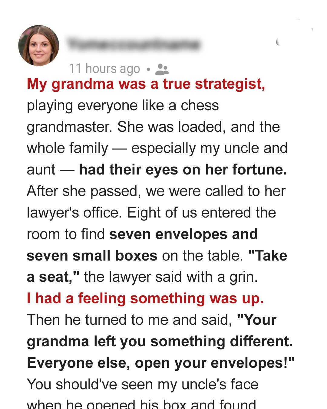 I was 15 when it happened. While my friends were busy with their summer flings and beach parties, I was content spending time with Grandma Rosalind. Her dimpled smile always made my day brighter.“Emily, dear,” Grandma once said, her voice soft and loving. “Would you like to help me with the garden later?”I nodded eagerly, ignoring the eye rolls from my uncle across the room. He never understood why I bothered with the “old lady”.