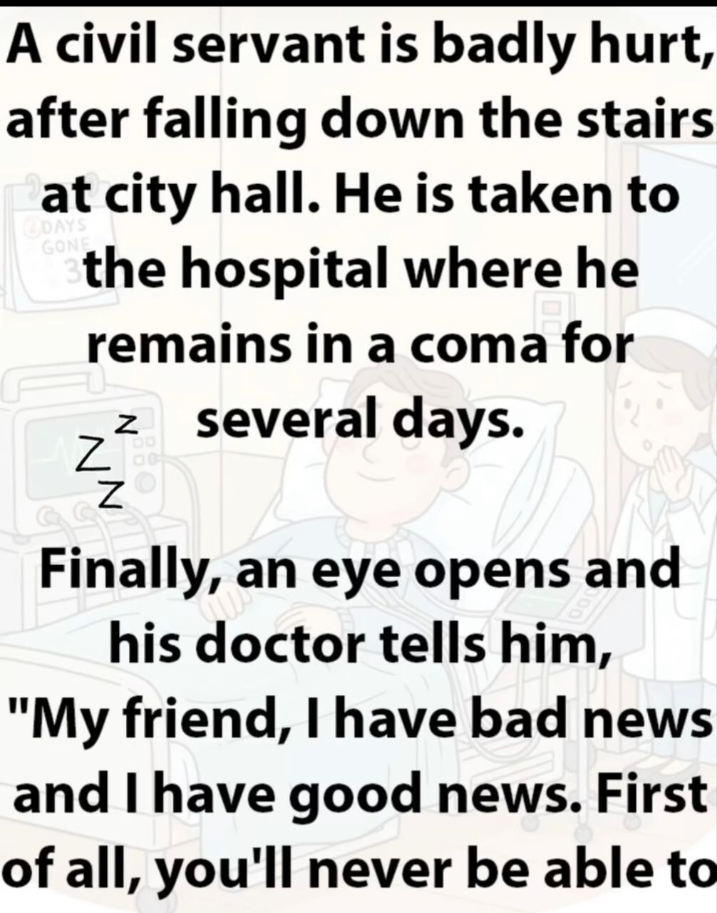 Civil ServantA civil servant is badly hurt, after falling down the stairs at city hall. He is taken to the hospital where he remains in a coma for several days. Finally, an eye opens and his doctor tells him, “My friend, I have bad news and I have good news.
