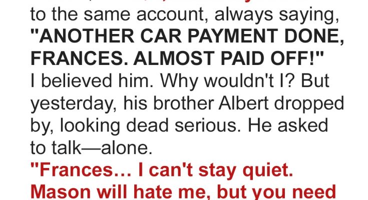 Every month-end, Mason walked through that front door, wearing the same easy smile, saying the same line like a script he’d memorized.“Well, Frances, another car payment done. Won’t be long now before it’s finally paid off.”And I believed him. Why wouldn’t I? We’d been married for 23 years, raised a son, bought a house, and survived layoffs and moves. Trust wasn’t something I questioned much until the day his brother knocked on our door.