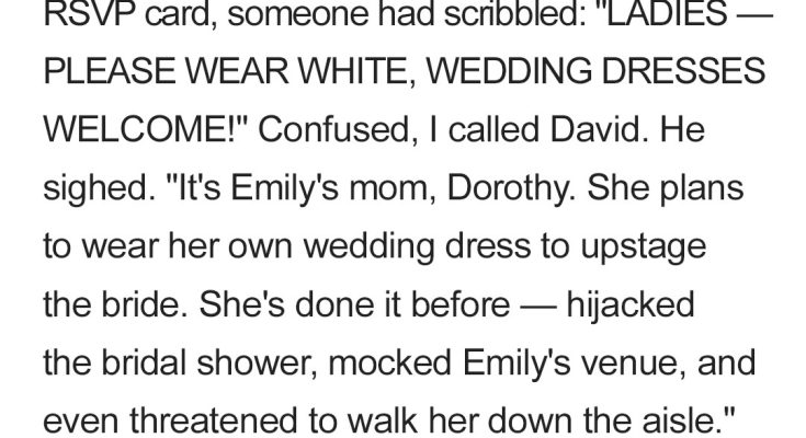 “It’s Emily’s mom,” he said, and I could almost hear him rubbing his temples. “Dorothy. She’s… she’s planning to wear her old wedding dress to upstage Emily.”