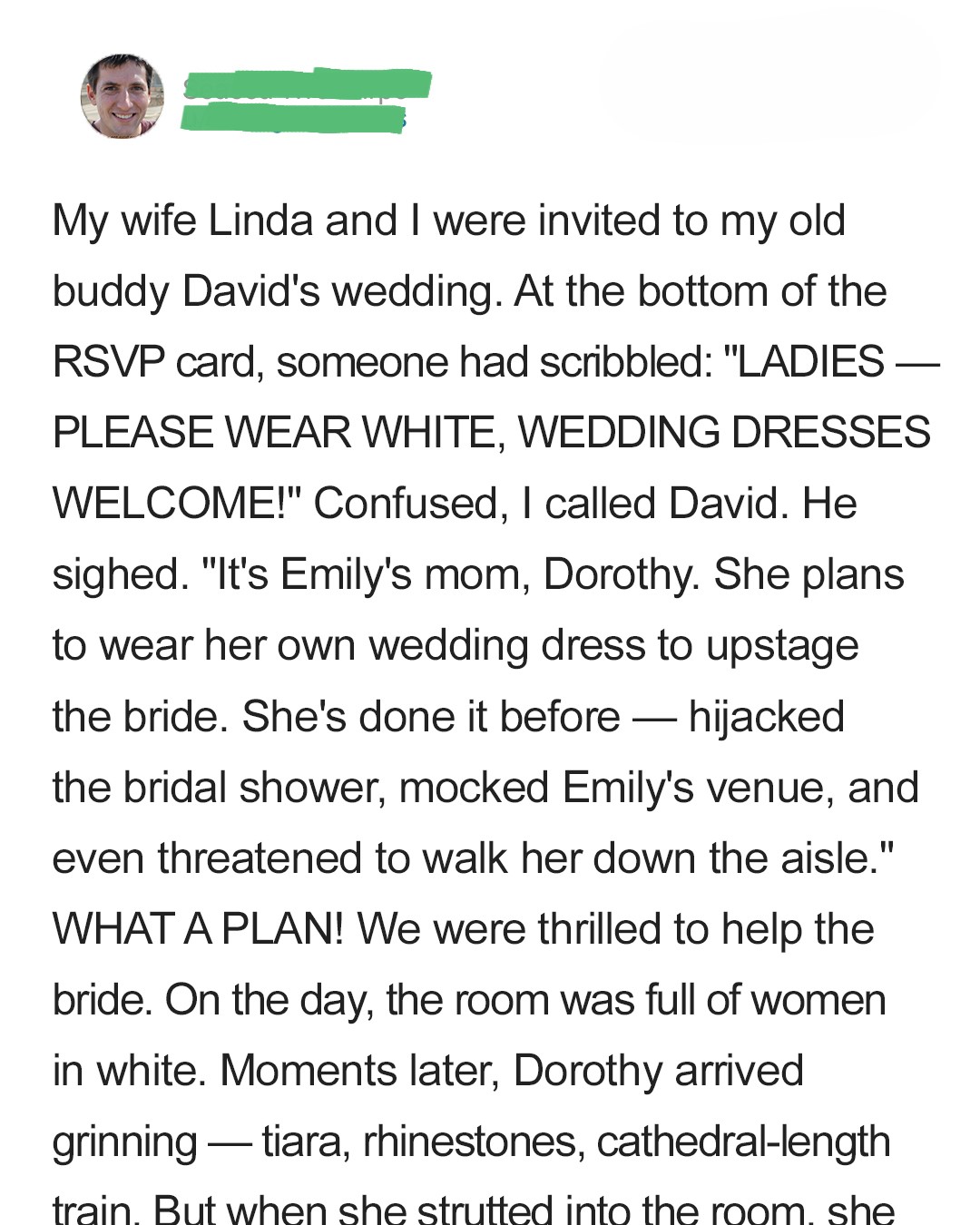 When a wedding RSVP card bizarrely invites all women to wear white, one guest suspects a scheme. Turns out, the bride’s dramatic mother plans to wear her own white gown to steal the spotlight. But the bride has a bold plan to outsmart her… and everyone’s in on it.I was sitting on the porch when my wife, Linda, found the wedding invitation in the mail.“It’s here! David and Emily’s wedding invitation,” she announced, slitting the envelope open with her finger.