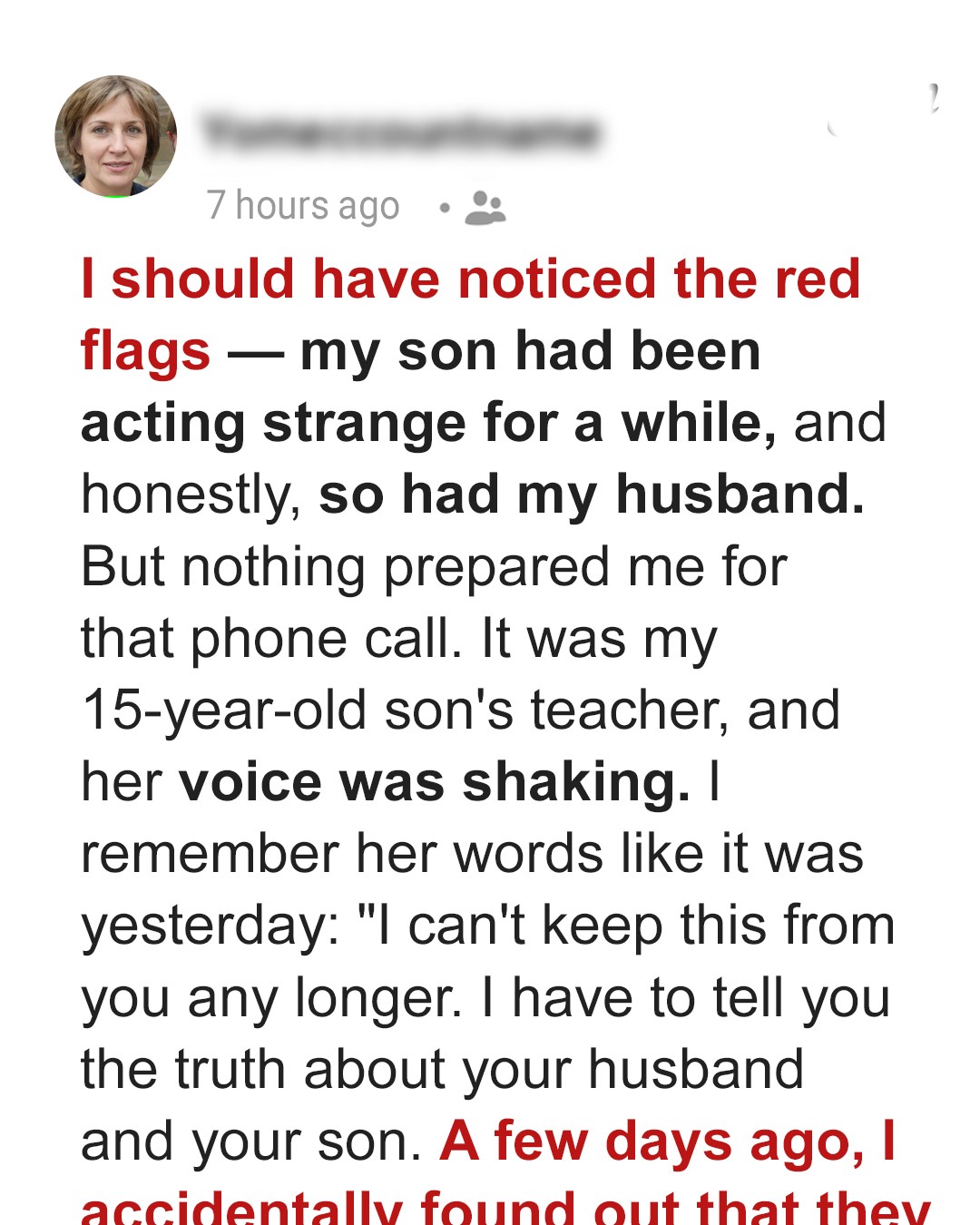 My husband, Daniel, is 42—a dependable man, or so I thought. We’ve been together for 17 years, built a life, a home, and raised our only child, Dylan, who just turned 15.Dylan has always been a quiet kid, more into books and video games than sports. He takes after me in that way—reserved, a little awkward, but with a heart of gold. Lately, though, something has been… off.He’s been distant and withdrawn. He doesn’t laugh at our inside jokes anymore, and whenever I ask him how school was, all I get is a vague “fine” before he disappears into his room.