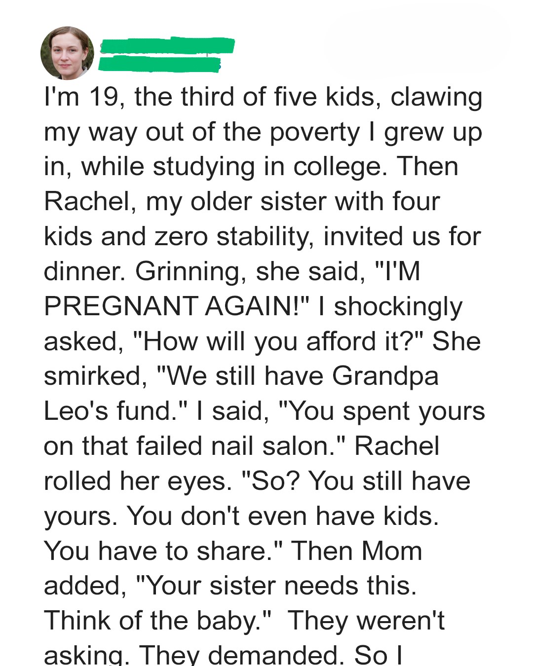 When my pregnant sister demanded I hand over my college fund to help with her fifth baby, I finally understood what it meant to choose yourself over family expectations.I’m the third of five kids in a family that’s been stuck in poverty for as long as anyone can remember.Growing up, we lived on hand-me-downs, church charity, and whatever pity our extended family could spare. I wore my older brother’s jeans with the holes sewn up, and my shoes came from the donation box at school.