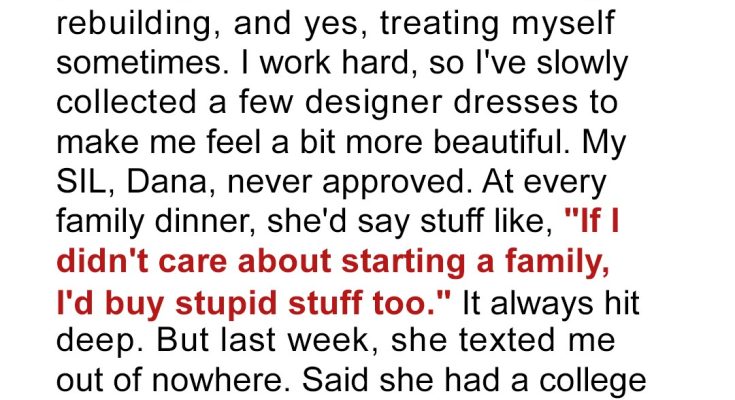 When my sister-in-law spent years mocking me for being “frivolous,” I stayed quiet. But when she needed my help to impress her old college friends at a party, I decided it was time she learned a lesson in humility.I’m 35 and childless, and apparently, that makes me a magnet for criticism, especially from my sister-in-law (SIL), Dana. But when she finally crossed a line I couldn’t ignore, I showed her a side of me that she wasn’t aware of, a side that finally shut her up for good!