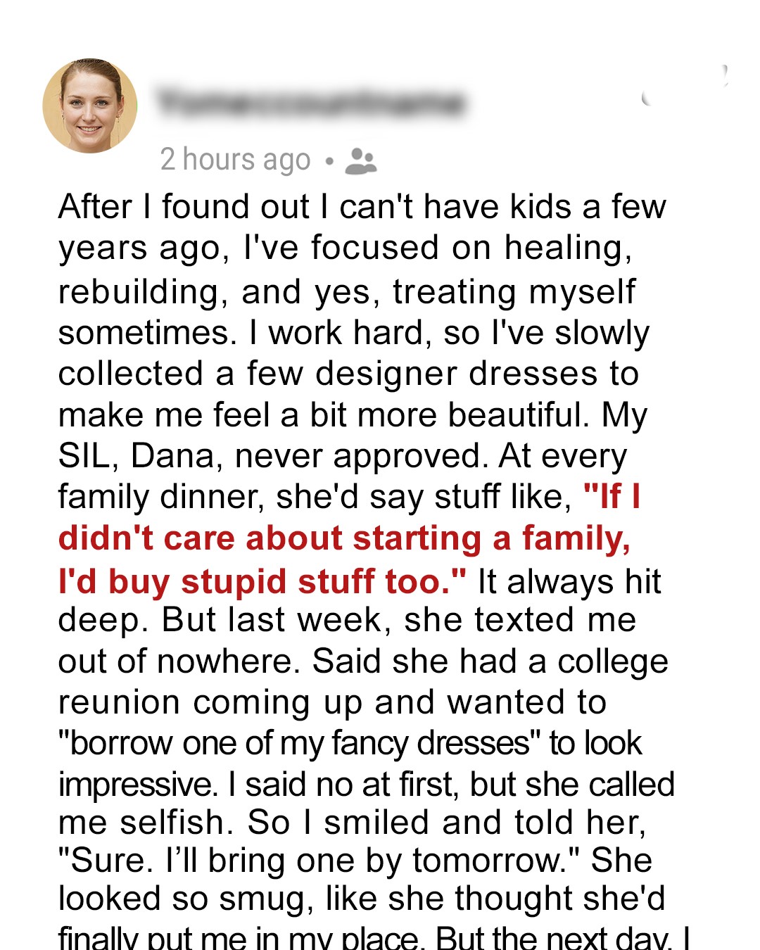 She probably thought I’d finally accepted my place as the “childless, frivolous” SIL she liked to mock.