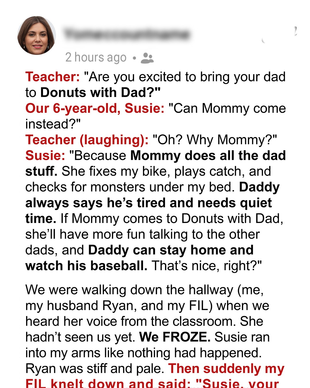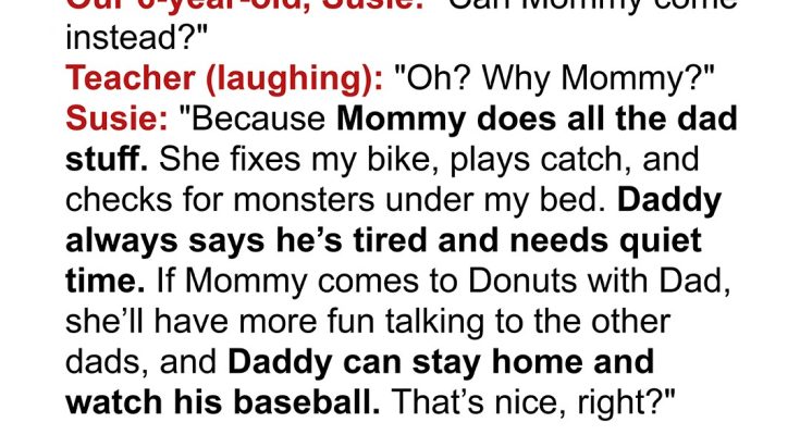 “Oh? Why Mommy? It’s for Dad’s…” Susie’s teacher paused, and then there was a light, awkward laugh.
