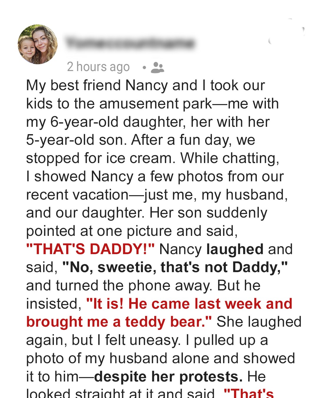 Sometimes, late at night, I look at Olive sleeping beside me, her breaths slow and steady. I think about how close I came to never knowing. If Connor hadn’t pointed at that picture, how many more years would I have spent living inside a beautiful lie?