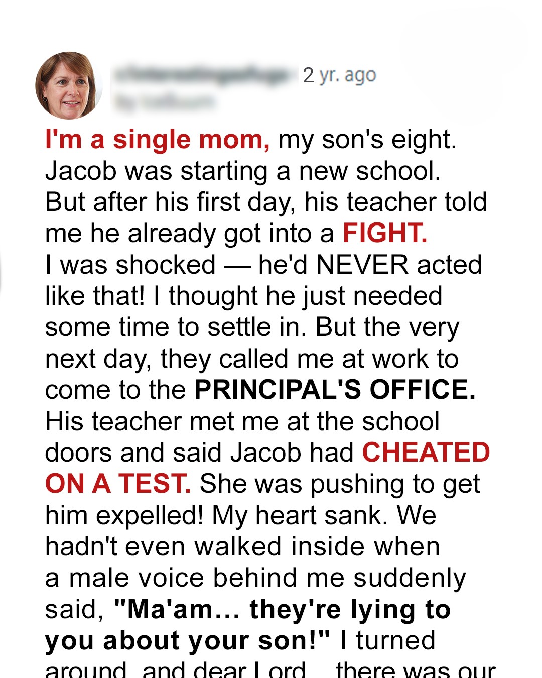 I arrived at my son’s new school anxious but hopeful, only to face his teacher’s troubling words: “Jacob had some challenges.” Yet something in my son’s sad silence hinted at a deeper problem—one I couldn’t yet see behind the school’s closed doors.The sun was warm, but I felt cold. As I stepped out of the car and onto the school sidewalk, my hands shook just a little.The air smelled like fresh-cut grass and new beginnings, but my thoughts were anything but light.