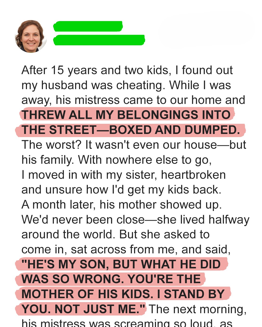 She took a deep breath. “I just learned what happened. I’m sorry for stepping in late, Samantha. Josh is my son, but what he did was SO wrong. You are the mother of his children, and in this story, I stand by YOUR side. And not just me…”