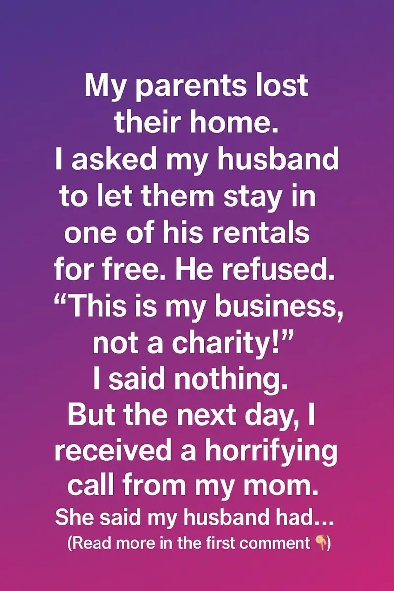 When my parents lost their home, I was heartbroken. I turned to my husband for help, asking him if they could stay in one of his rental properties until they got back on their feet. To my surprise, he firmly refused, saying, “This is my business, not a charity.” His words stung deeply, but I chose to stay silent, hoping the situation would somehow work itself out.