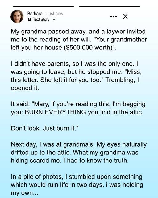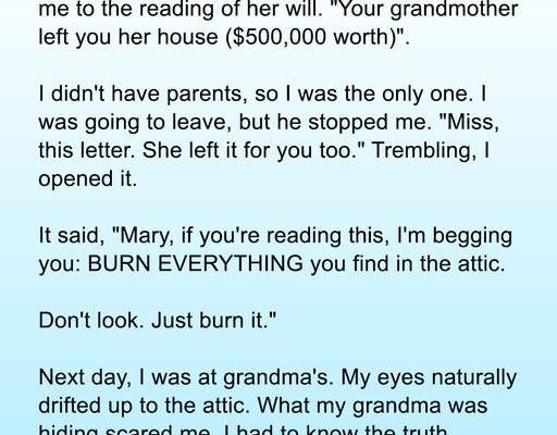 When Grandma died, I didn’t just inherit her house—she left me a strange note too. It said: “Burn everything in the attic.”I didn’t listen. And because of that, I learned something that shattered everything I thought I knew about my family.I always figured I’d end up alone one day. But not like this. Not so soon.