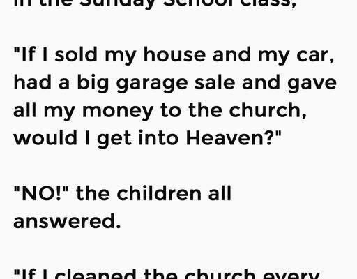 The teacher asked the children in the Sunday School class,“If I sold my house and my car, had a big garage sale and gave all my money to the church, would I get into Heaven?”“NO!” the children all answered. “If I cleaned the church every day, mowed the yard, and kept everything neat and tidy, would I get into Heaven?”