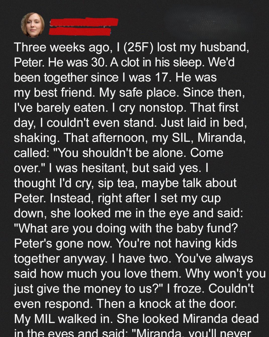 Still reeling from the sudden loss of her husband, Kate accepts an invitation from her sister-in-law, hoping for comfort. But instead of sympathy, she’s hit with a shocking request that twists her grief into guilt and reveals a disturbing truth about the people closest to her.People say grief hits you like a truck, but they’re wrong. A truck would be kinder, a truck would be over in seconds.Have you ever felt your entire world collapse? Not just shake or crack, but completely implode? That’s what happened to me.