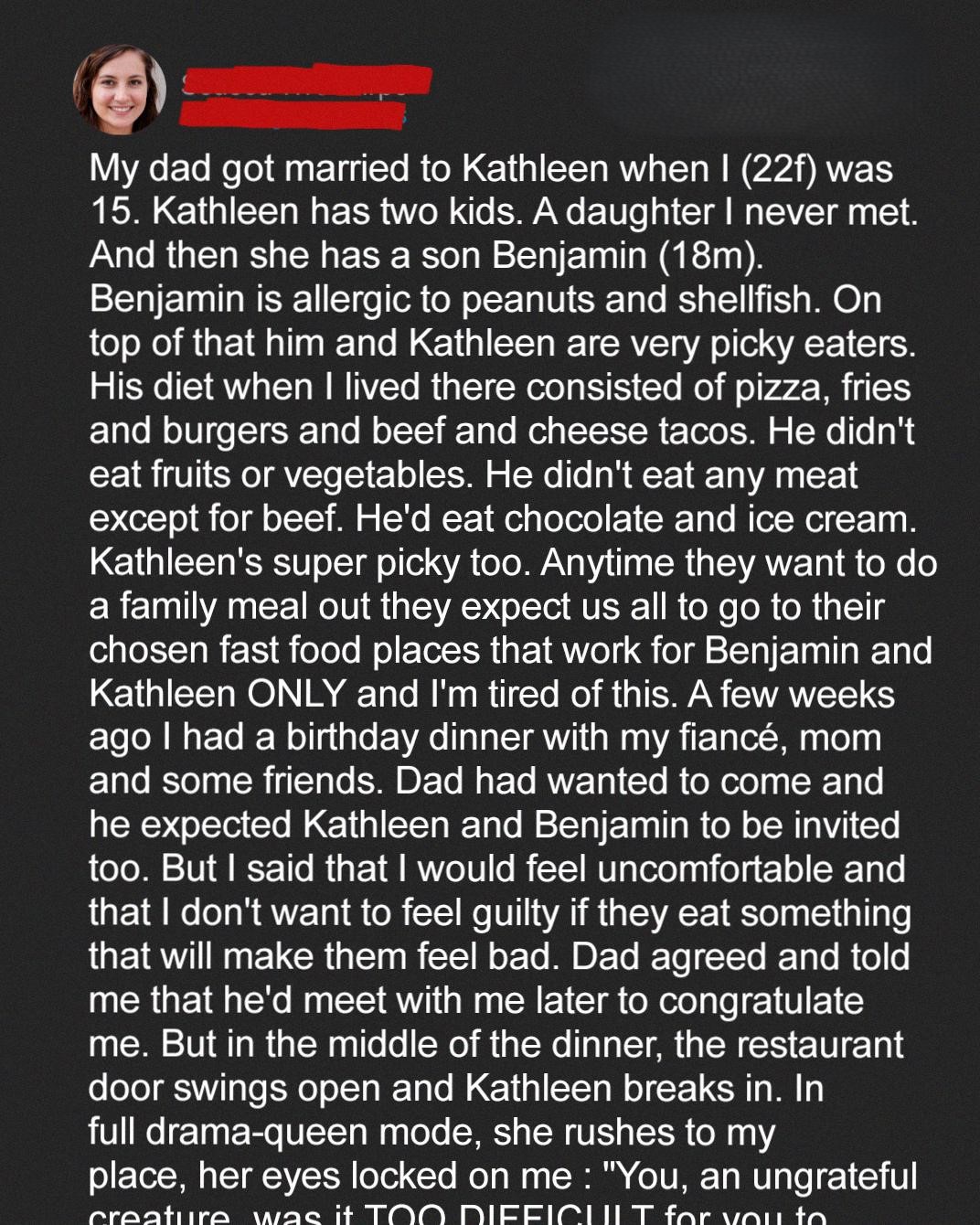 My birthday dinner was perfect until the restaurant doors slammed open. My stepmom stormed in and publicly accused me of “betraying the family” for not catering to her and my stepbrother’s restrictive food rules. Before I could say a word, someone else rose to my defense.I’d been biting my tongue for seven years, ever since my dad married Kathleen.She arrived like a walking whirlwind when I was 15. I never met her daughter (she lives on the other side of the country), but her son, Benjamin, I got to know all too well.