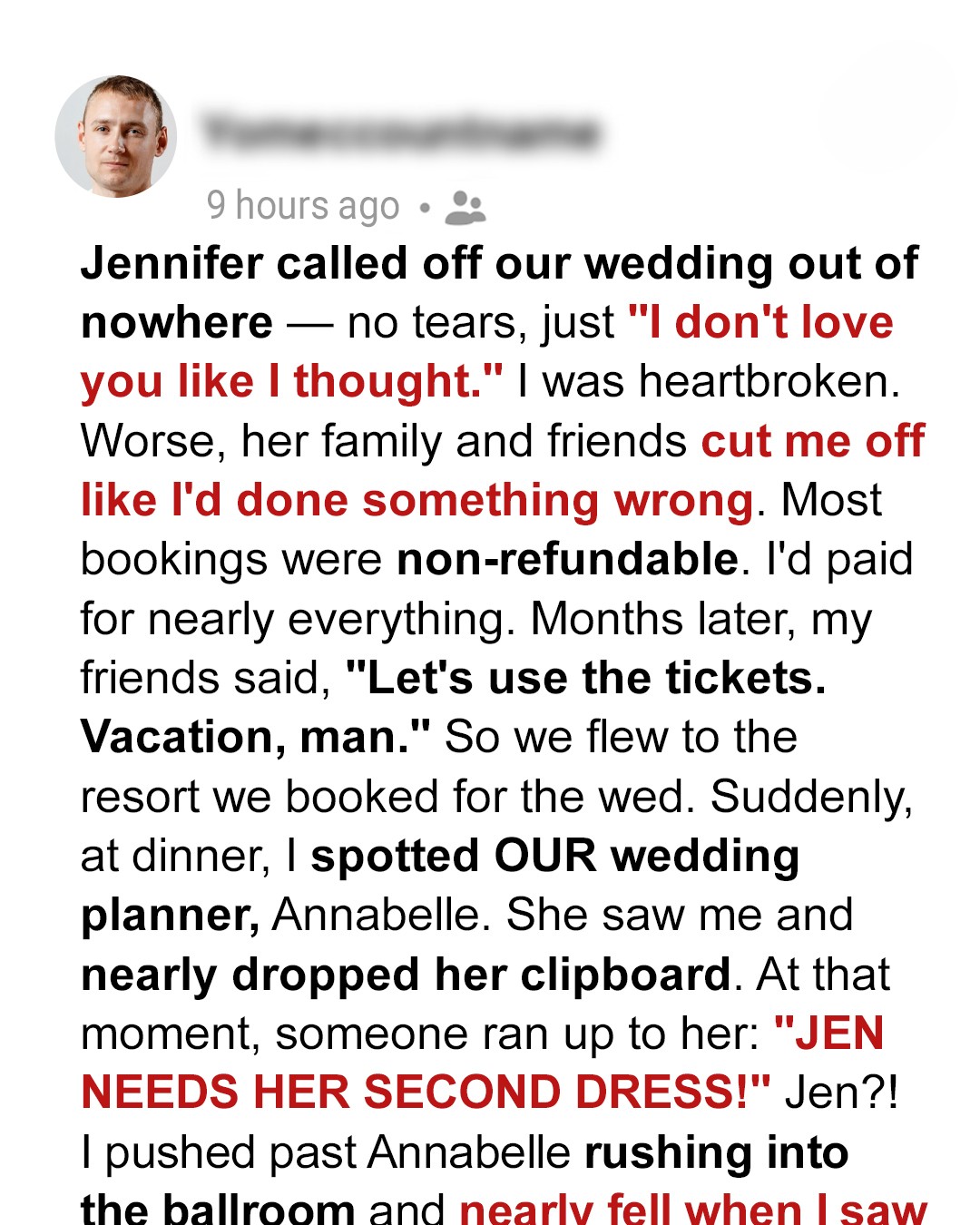 “She told everyone I cheated. She said she had to call off the wedding. But surprise! Jennifer kept it the same. Same venue. Same vendors. Same date. She just replaced the groom.”