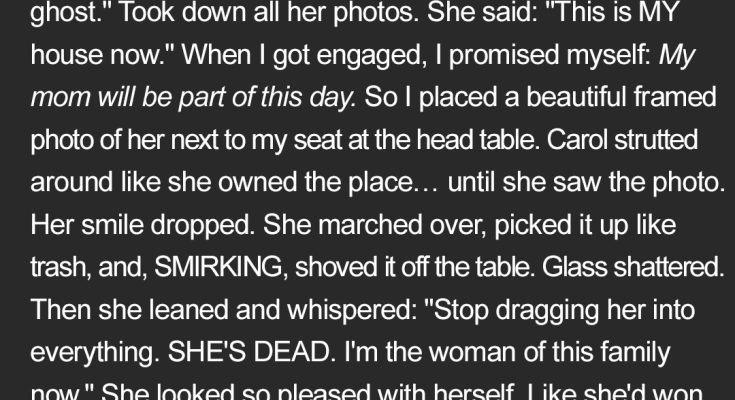 When Carol smashed my mom’s photo at my wedding reception, she thought she’d finally won. She stood there smirking, waiting for me to crumble. But she had no idea what was about to walk through those double doors in exactly 60 seconds.I’m 27 years old, and my mom died when I was 19.