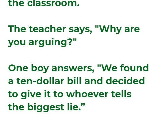 Two students were arguing when their teacher entered the classroom. The teacher says, “Why are you arguing?”One boy answers, “We found a ten-dollar bill and decided to give it to whoever tells the biggest lie.”“You should be ashamed of yourself,” said the teacher, “when I was your age, I didn’t even know what a lie was.”