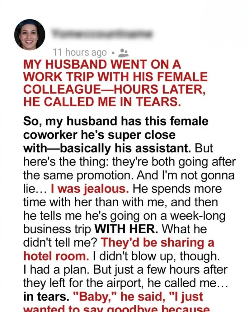 When my husband, Cameron, left for a business trip with his colleague, I never imagined how much that journey would change our lives. For months, I’d felt the growing distance between us — too many late nights, too many silences that spoke louder than words. When I discovered a shared hotel reservation, my trust cracked.
