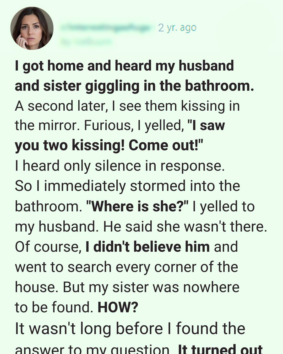 A woman’s giggle. Familiar. Too familiar.My steps slowed as I moved deeper into the house, my pulse quickening. The bathroom door was slightly ajar, light spilling into the hallway. I froze when I heard my husband’s voice—low, playful—and then another giggle answered him.