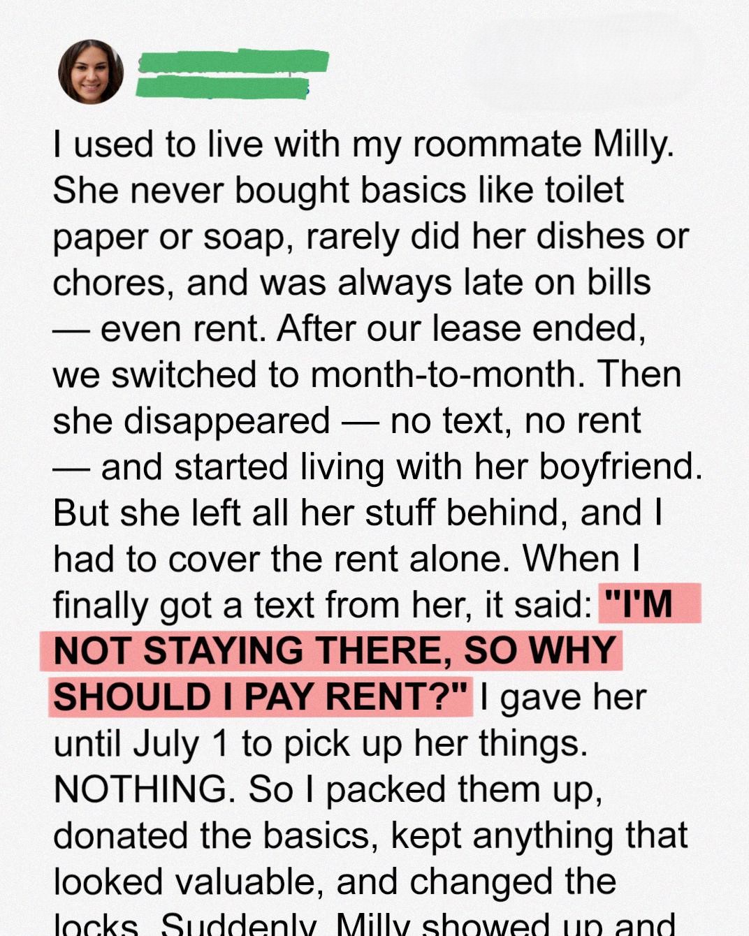 When my roommate disappeared overnight to live with her boyfriend, I thought she’d at least handle the rent situation like an adult. Two months later, she showed up pounding on my door, screaming about changed locks and missing belongings.When I first rented this place, the landlord told me there was already one person living here, and they just needed one more roommate. Her name was Milly.Honestly, I was happy about it. Living alone seemed scary, and having someone to split the bill with sounded perfect. I thought I’d found the ideal situation.