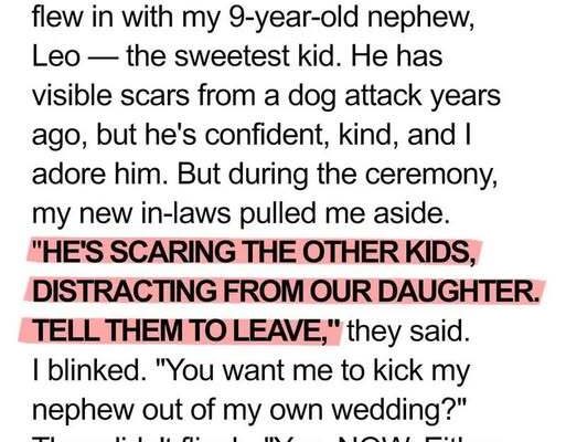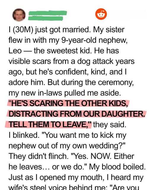I (30M) just got married. My sister flew in with my 9-year-old nephew, Leo — the sweetest kid.He has visible scars from a dog attack years ago, but he’s confident, kind, and I adore him. But during the ceremony, my new in-laws pulled me aside.‘HE’S SCARING THE OTHER KIDS, DISTRACTING FROM OUR DAUGHTER.’‘TELL THEM TO LEAVE,’ they said.I blinked. ‘You want me to kick my nephew out of my own wedding?’ They didn’t flinch. ‘Yes. NOW. Either he leaves… or we do.’