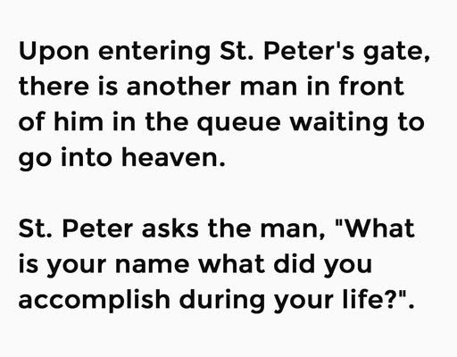 “Very well,” says St.Peter, “Here is your silk robe and golden scepter, now you may walk in the streets of our Lord.”St. Peter looks at the Father, and asks “What is your name and what did you accomplish?”