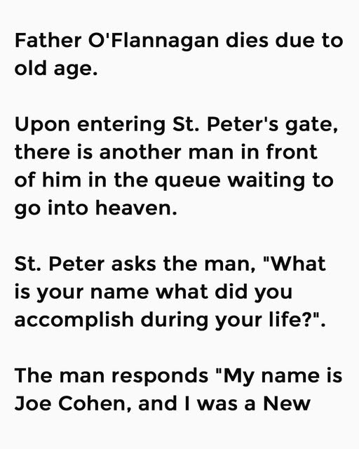 Father O’Flannagan dies due to old age. Upon entering St. Peter’s gate, there is another man in front of him in the queue waiting to go into heaven.St. Peter asks the man, “What is your name what did you accomplish during your life?”. The man responds “My name is Joe Cohen, and I was a New York city taxi driver for 14 years”