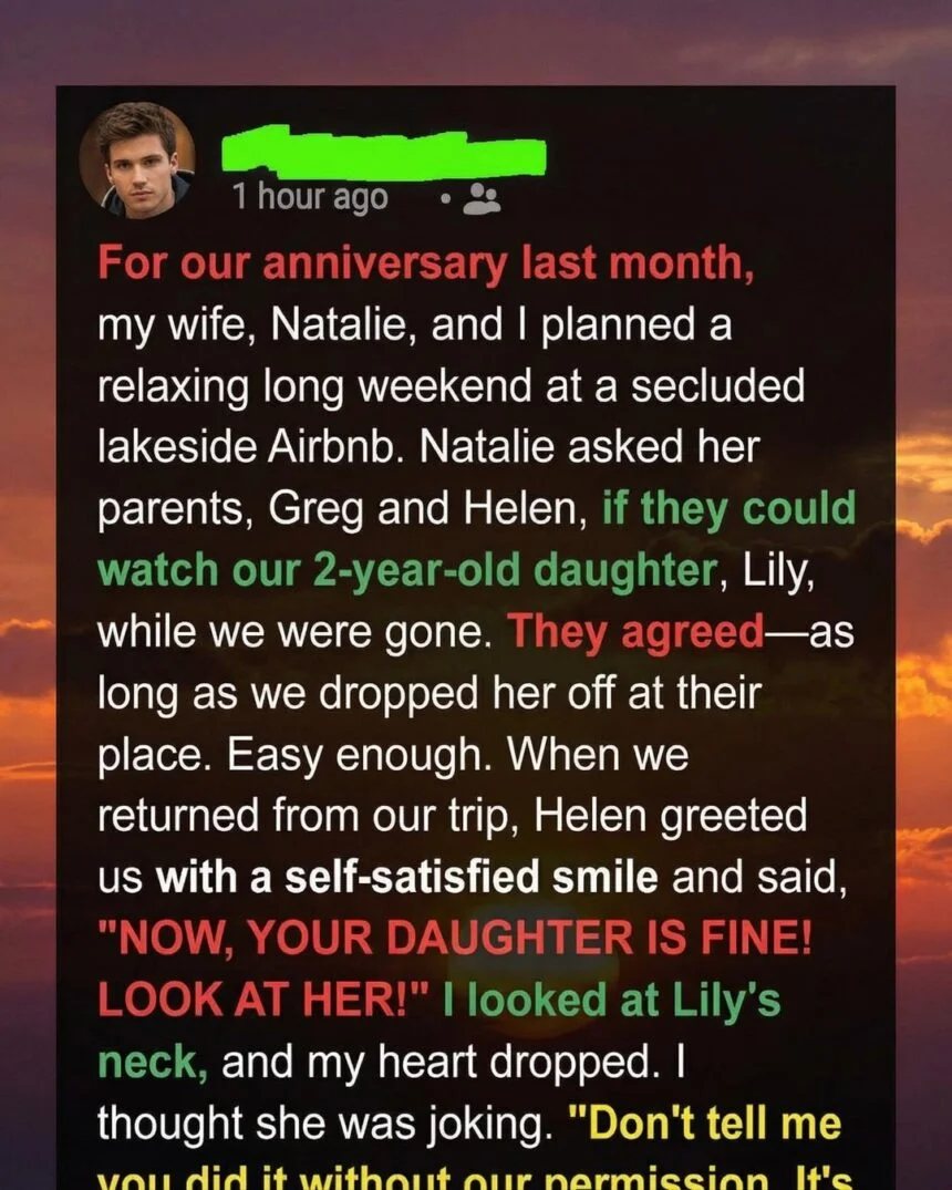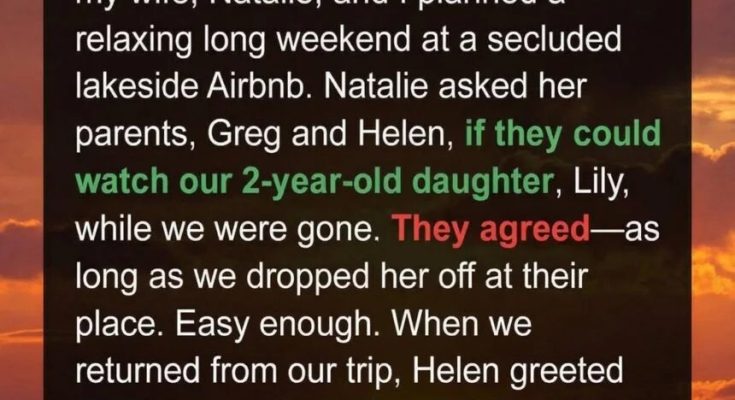 For our anniversary last month, my wife, Natalie, and I planned a relaxing long weekend at a secluded lakeside Airbnb. Natalie asked her parents, Greg and Helen, if they could watch our 2-year-old daughter, Lily, while we were gone. They agreed—as long as we dropped her off at their place.