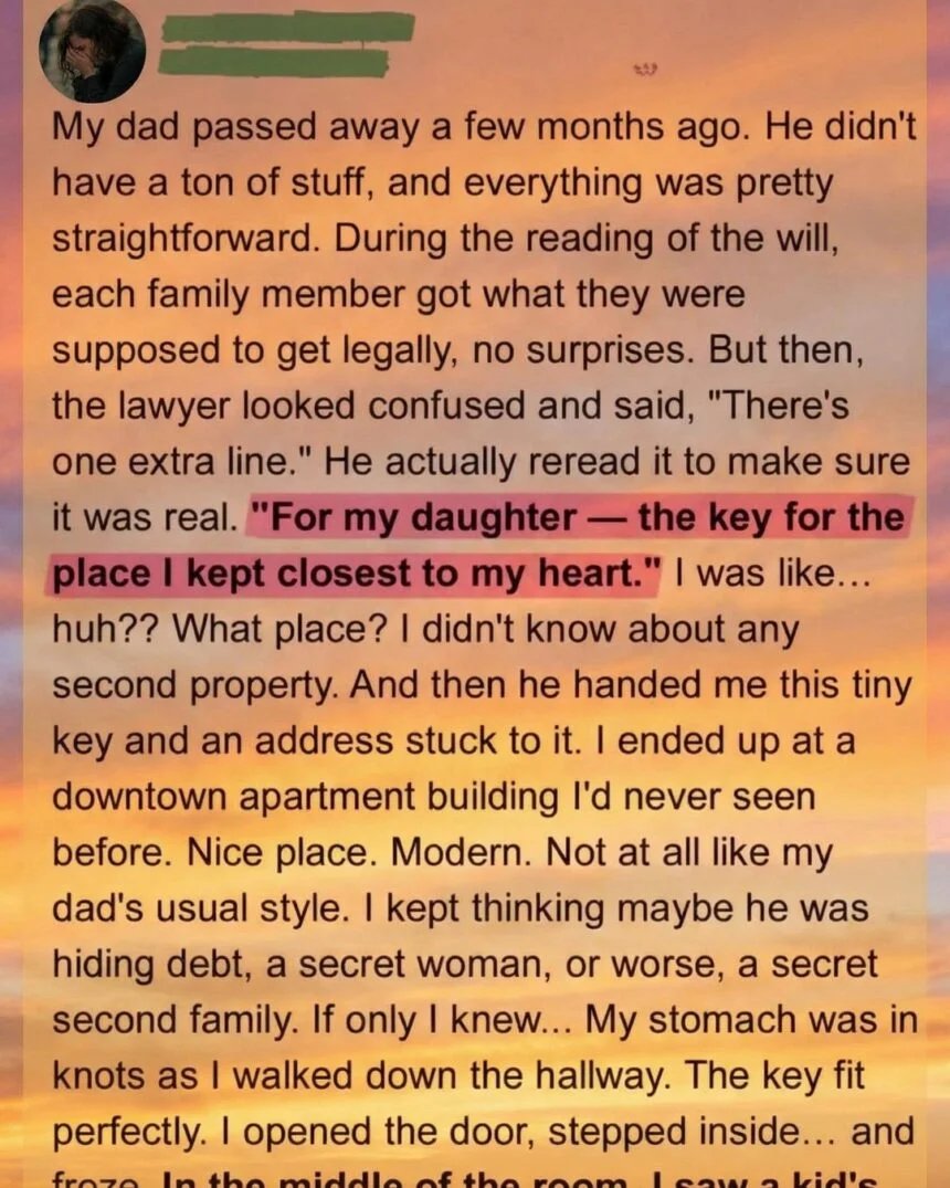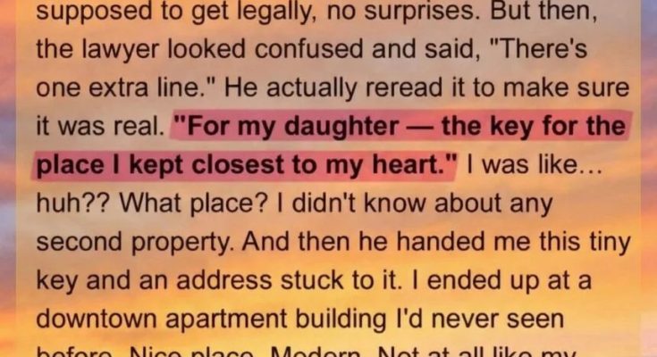 But then, the lawyer looked confused and said, “There’s one extra line.” He actually reread it to make sure it was real. “For my daughter – the key for the place I kept closest to my heart.” I was like… huh?? What place?
