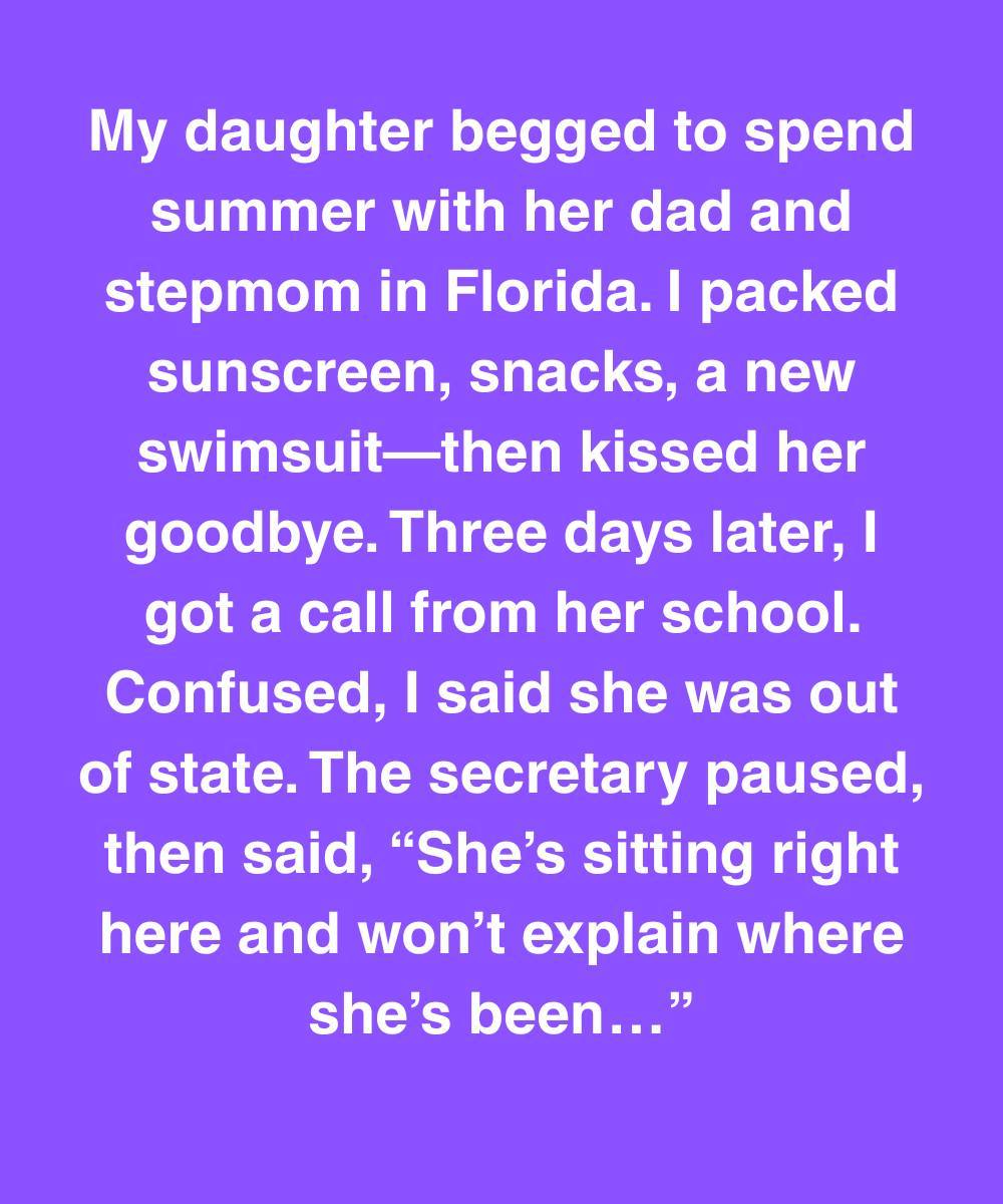 My daughter begged to spend summer with her dad and stepmom in Florida. I packed sunscreen, snacks, a new swimsuit—then kissed her goodbye. Three days later, I got a call from her school. Confused, I said she was out of state. The secretary paused, then said, “She’s sitting right here and won’t explain where she’s been…”I nearly dropped the phone.“Can we just go home?” she said.Not until we were halfway down the highway did she say anything else. And it wasn’t what I expected.“Please don’t make me go back there.”