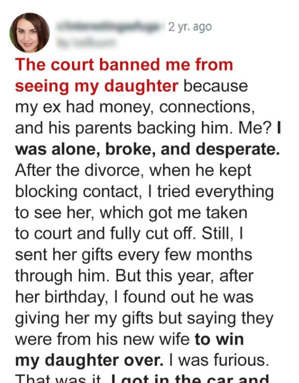 “What was I supposed to do? I was desperate!” I cried. “You never let me talk to her. I called. I wrote. I begged. You blocked my number. You returned my letters unopened!”