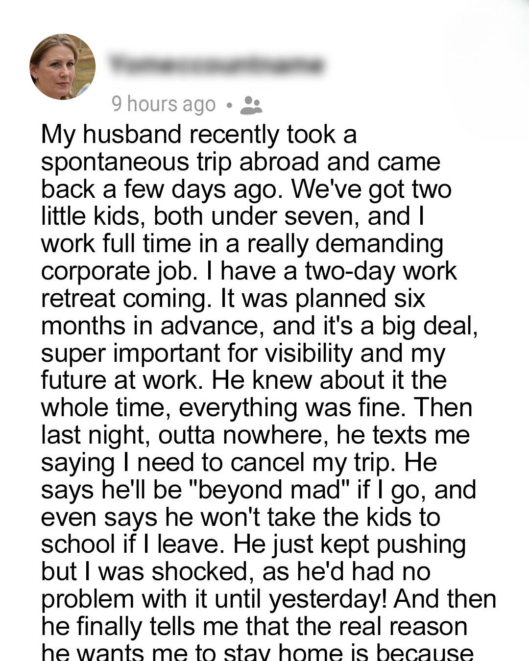 I had spent six months preparing for a work retreat that could move my career to the next level. My husband, Robert, had agreed to take care of the kids and encouraged me every step of the way—until the night before my flight. That evening, he suddenly told me I couldn’t go. At first, he mumbled about recovering from minor surgery, then flat-out called my trip “stupid” and refused to help. I was stunned. I had supported him through everything, including his last-minute travel, yet the moment it was my turn, he shut me down without a second thought.