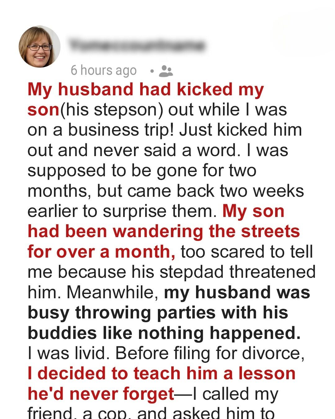 I thought I knew the man I married, calm, dependable, the kind of guy who never lost control. But everything I believed about him shattered the day I came home early from my trip.I always thought we were just a regular family. My name’s Jennifer, and I’m 40 years old. I’ve got a 17-year-old son, Caleb, from my first marriage, whom I absolutely adore. When I discovered my husband had kicked Caleb out while I was gone, I ensured he learned a lesson he’d never forget.