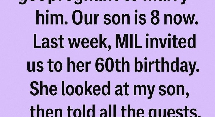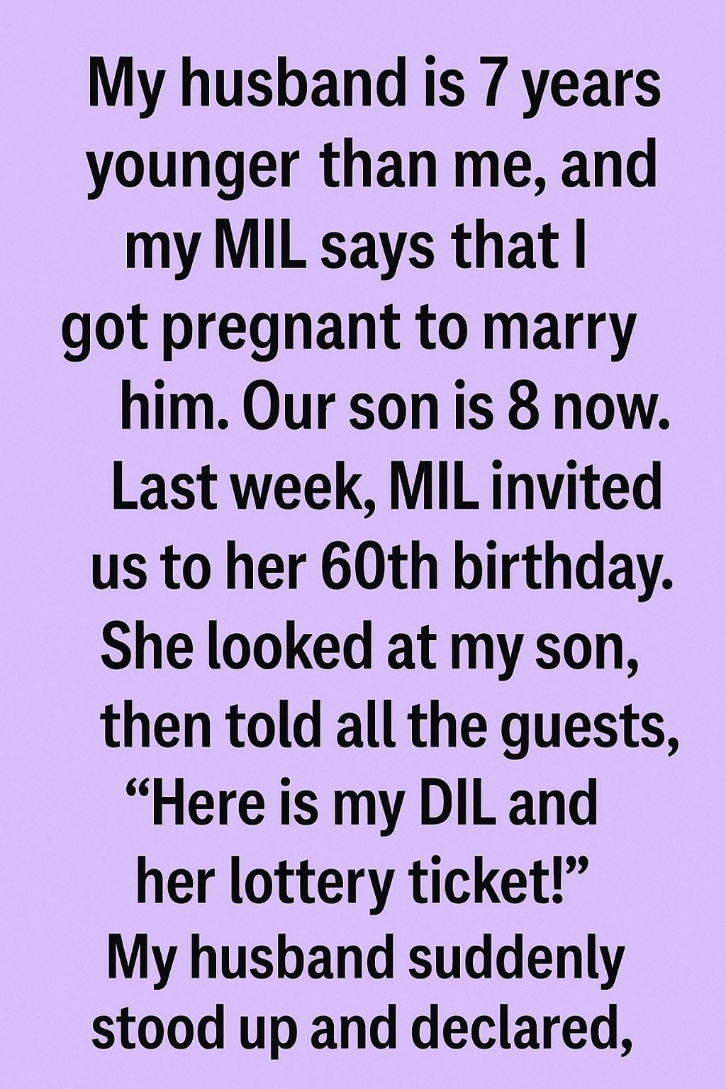 My husband is 7 years younger than me, and my MIL claims that I got pregnant to marry him. Our son is 8 old now. Last week, MIL invited us to her 60th birthday.She looked at my son, and the she told all the guests,“Here is my DIL and her lottery ticket!”