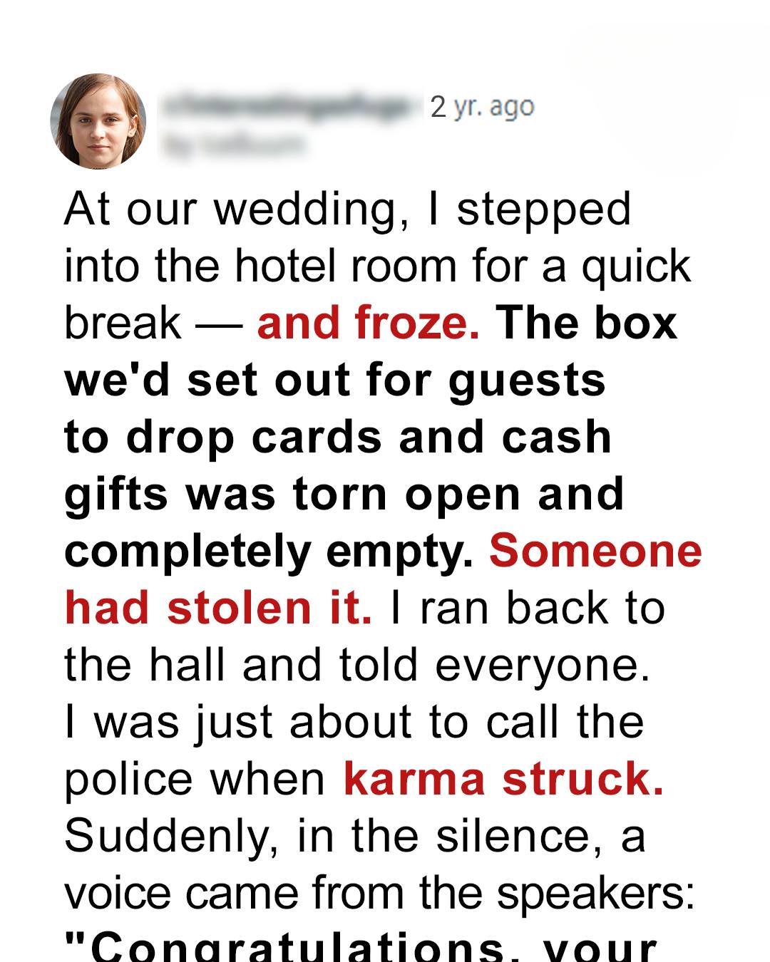 On what should’ve been the happiest night of my life, I stepped away from our buzzing reception to catch my breath and found the wedding card box, once full of cash, checks, and heartfelt wishes, ripped open and completely empty. Panic surged through me as I tried to piece together what had happened. I rushed downstairs to Joshua, and the moment he saw my face, he knew something was terribly wrong.
