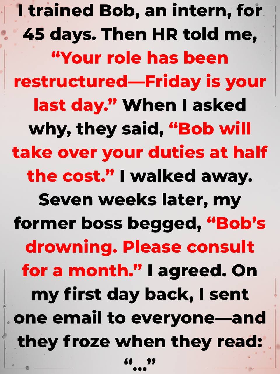 Hi Bright Side,I was asked to train Bob, an intern, and share all my skills for 45 days.After onboarding was completed, HR came to me and said, “Your position has been ’restructured.’ Friday would be your last day.” Shocked, I asked why.