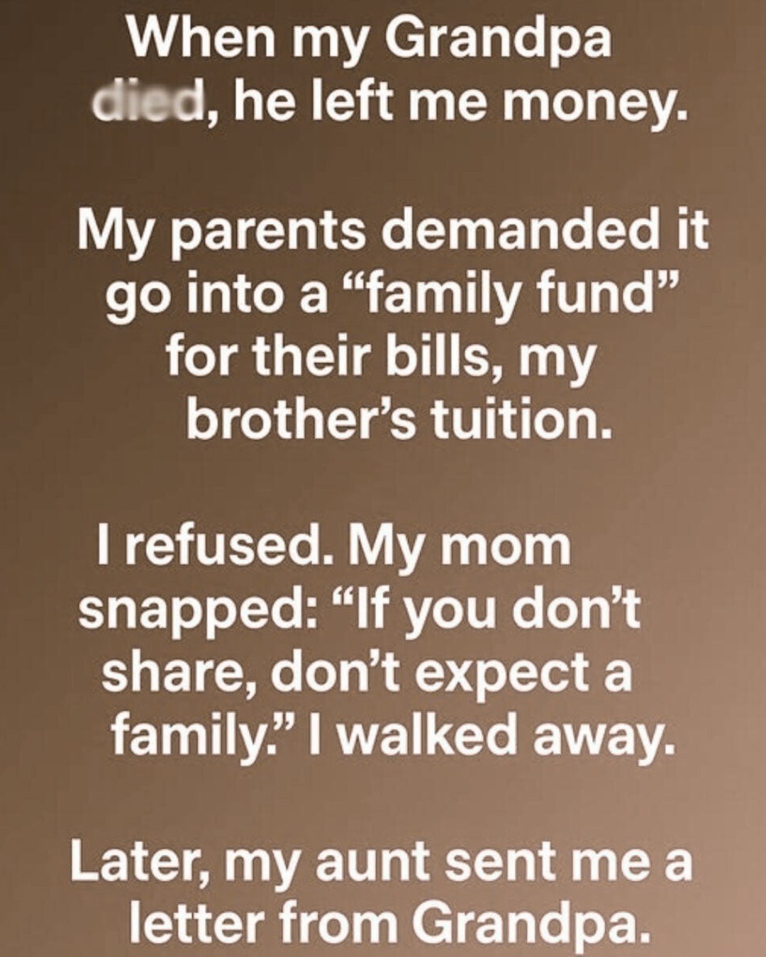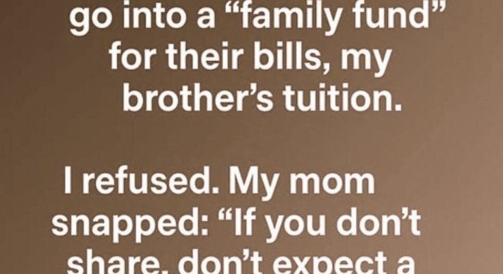 When my grandfather di:ed, he left me a sum of money. Almost immediately, my parents suggested it should go into a “family fund” to help with household bills and my brother’s college costs. They insisted it was the sensible, mature choice and when I hesitated, their disappointment felt like a weight on my chest.