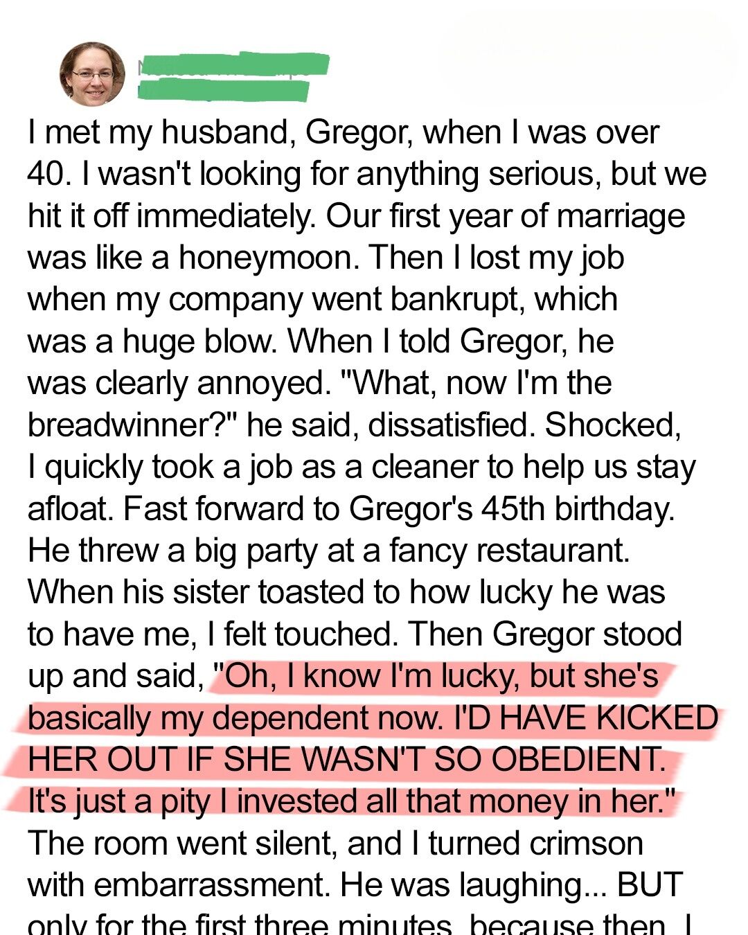 When Abby loses her job, she seeks comfort in her husband, Gregor, to keep them afloat until she finds another. But while Abby assumes that Gregor will be supportive, she finds out how he really feels when they celebrate his birthday surrounded by their closest people…I’m not usually one to share my life online, but after what happened recently, I figured my story should be shared. Let me tell you all about the time my husband tried to humiliate me in front of his friends and how I turned the tables on him in the most satisfying way.