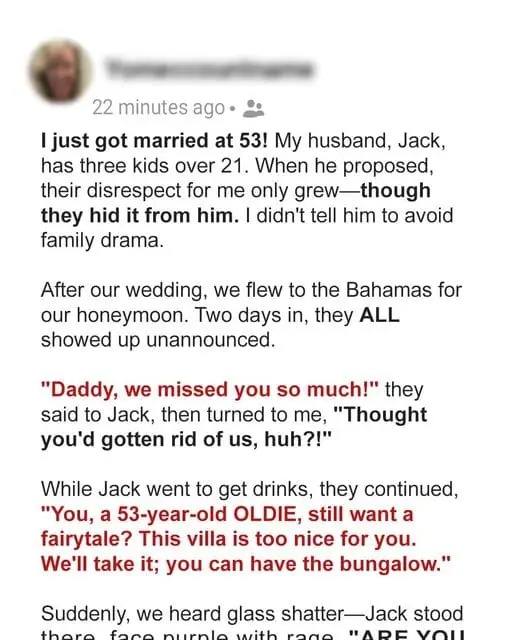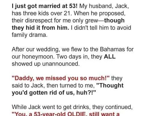 I didn’t tell him to avoid family drama.After our wedding, we flew to the Bahamas for our honeymoon.Two days in, they ALL showed up unannounced.“Daddy, we missed you so much!” they said to Jack, then turned to me, “Thought you’d gotten rid of us, huh?!”