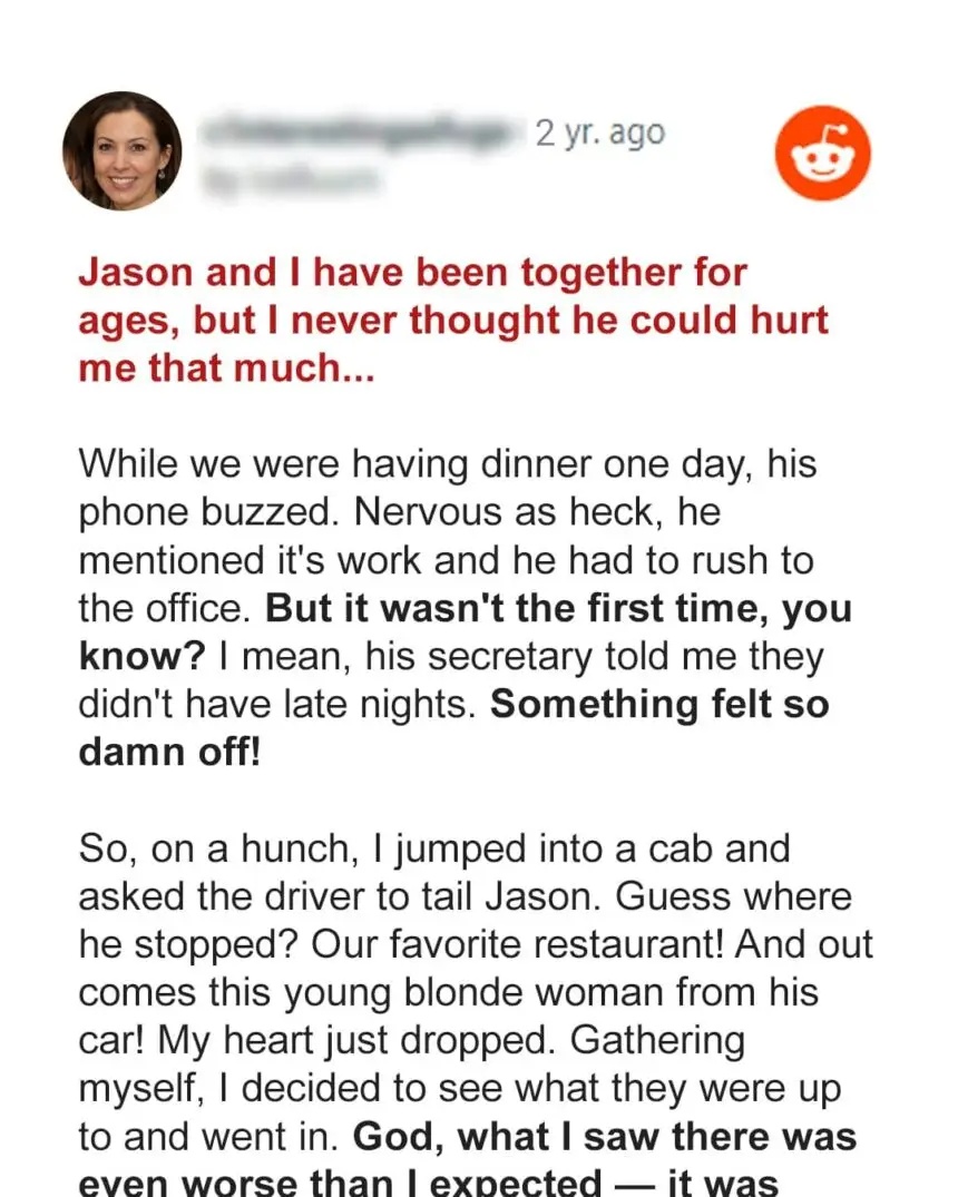 “I think he is having an affair,” Jessica said. “He has been behaving oddly for at least the past two weeks and says he’s working late. We’ve been married for thirty years, and I know when he’s lying.