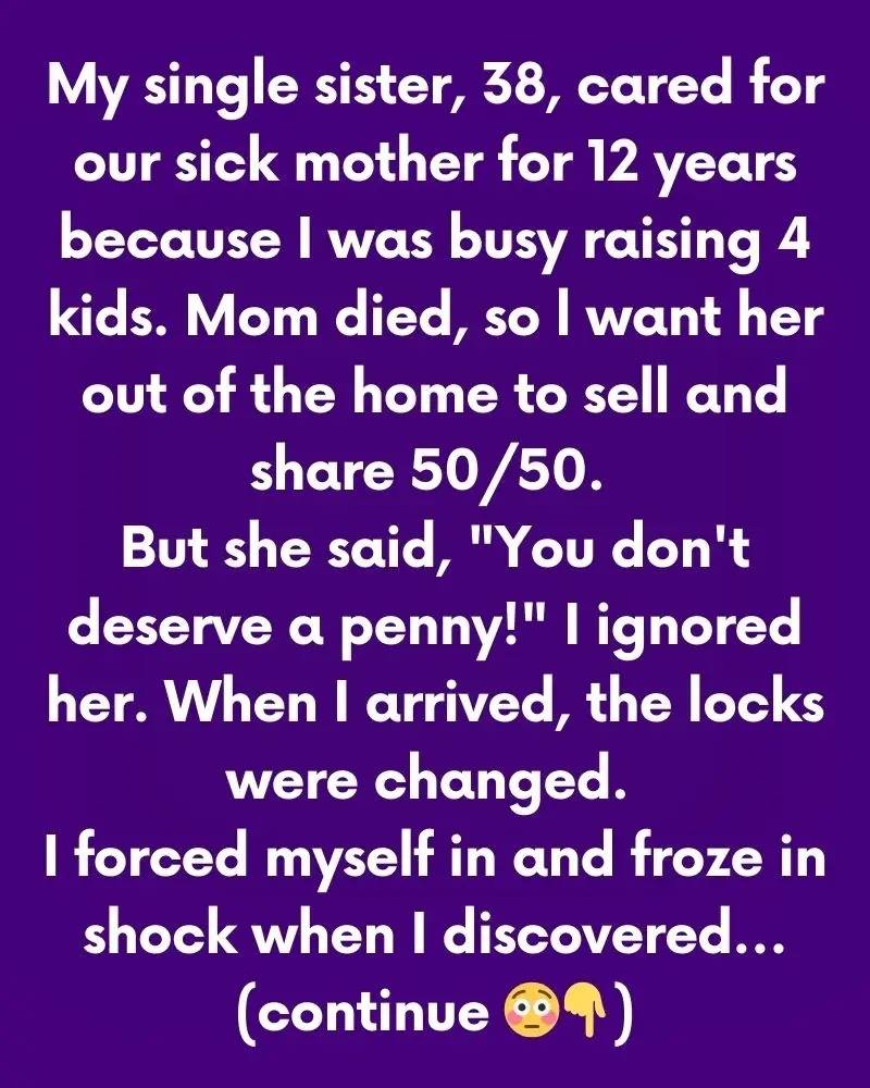 Seeking guidance, she reached out to us for advice.My single sister, 38, cared for our sick mother for 12 years because I was busy raising 4 kids. Mom died, so I want her out of the home to sell and share 50/50. But she said, “You don’t deserve a penny!