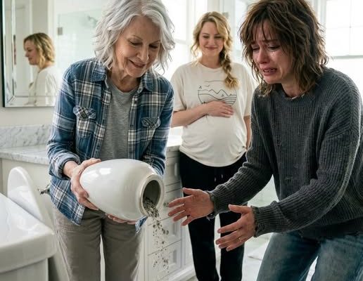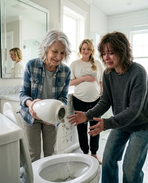 I pushed past my mother when she realized where I was headed. The toilet lid was up. Pale gray residue clung faintly to the porcelain near the drain, visible under the vanity light. My stomach lurched so violently I had to grip the sink. I kept the phone steady, forcing myself to capture everything—the angles, the paper towel roll, the open cabinet, the still-damp flush handle.