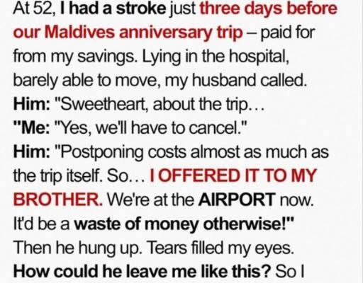 I had a stroke three days before our Maldives anniversary trip, paid for by my funds, at 52. My spouse called from the hospital, barely moving. He asked, “Sweetheart, about the trip…”