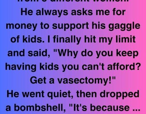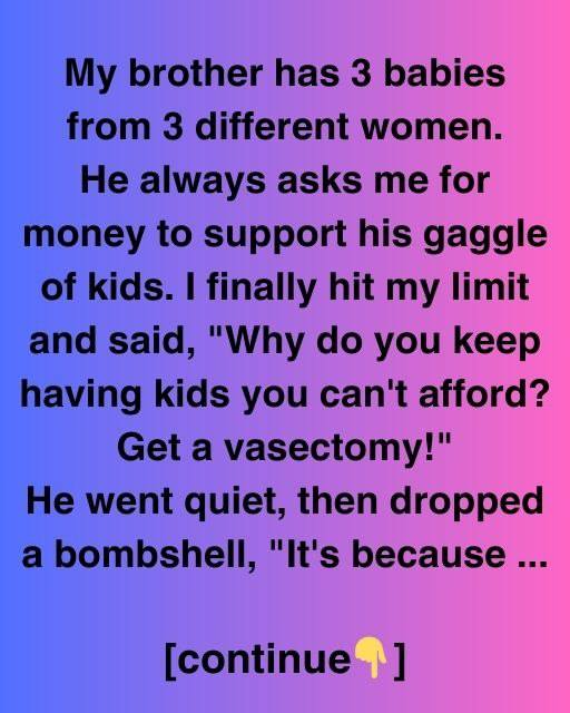 My brother has 3 children from 3 women. Always requests for money to support his multiple children. I finally asked, “Why do you keep having kids you can’t afford?” Get vasectomy!