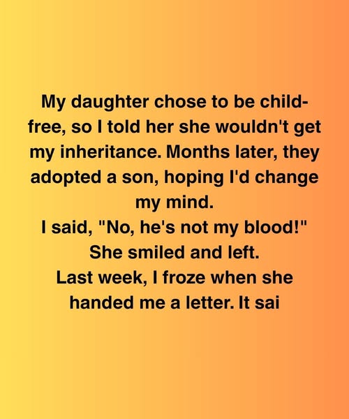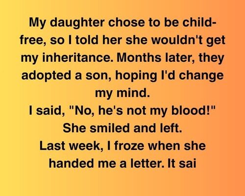“My daughter chose to be child-free, so I told her she wouldn’t get my inheritance. Months later, they adopted a son, hoping I’d change my mind. I said, ‘No, he’s not my blood!’