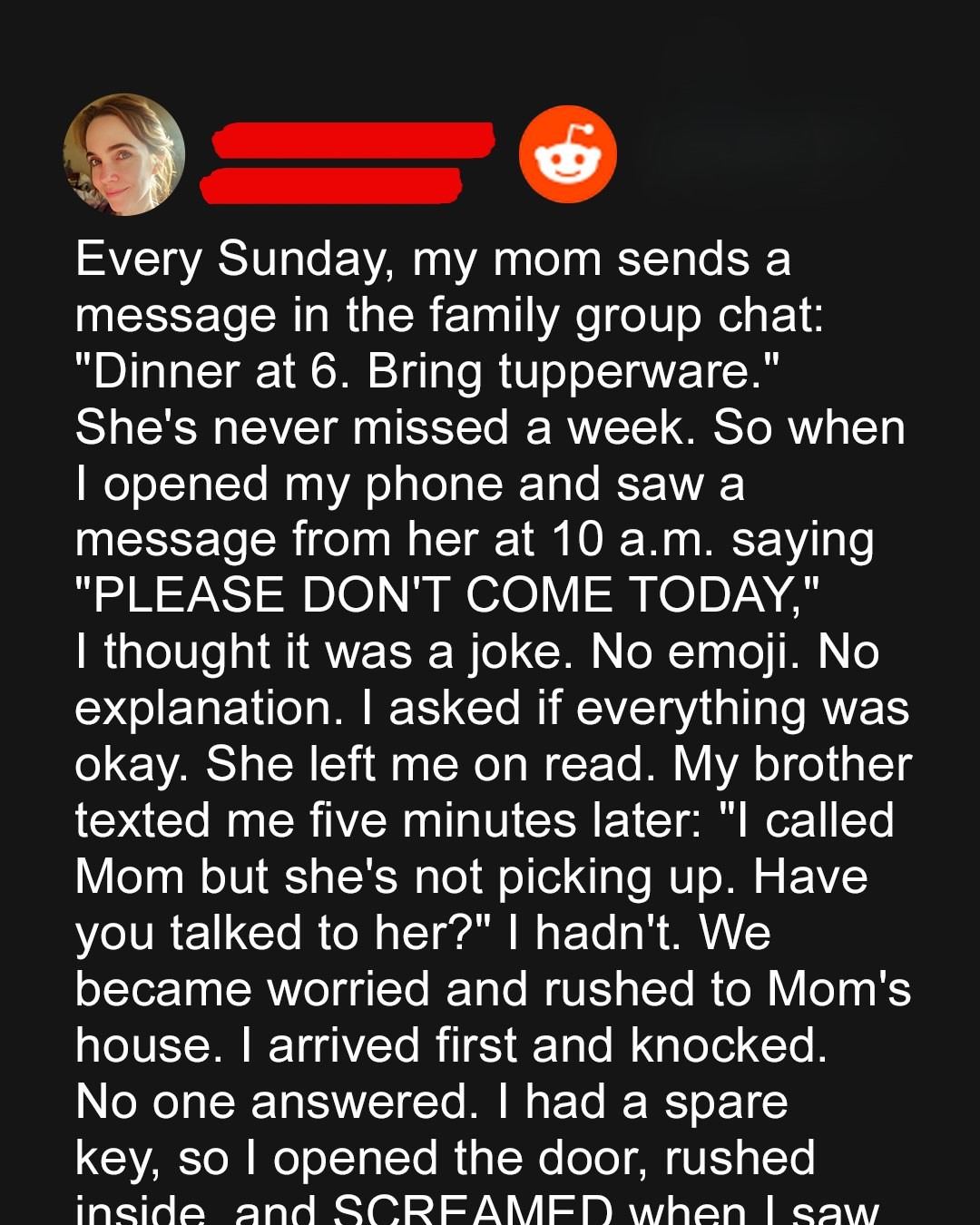 Mom Hosted Dinner Every Sunday Until One Week She Texted, ‘Please Don’t Come Today’ — I Rushed over and Screamed When I Opened the Door