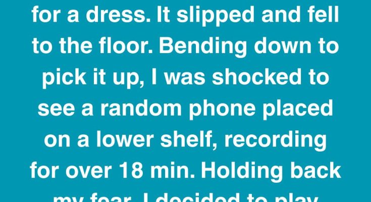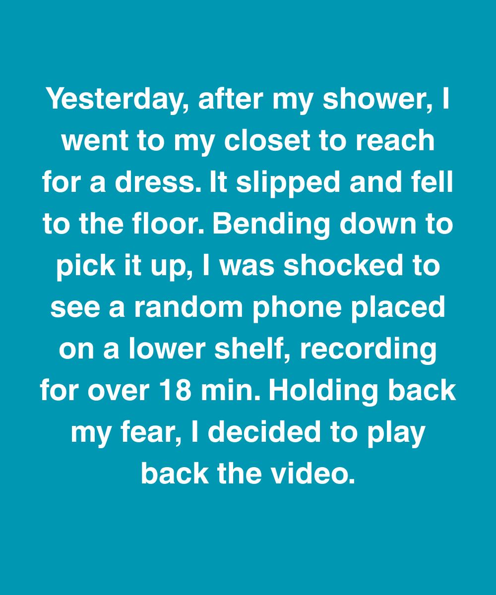 Yesterday, after my shower, I went to my closet to reach for a dress. It slipped and fell to the floor. Bending down to pick it up, I was shocked to see a random phone placed on a lower shelf, recording for over 18 min.